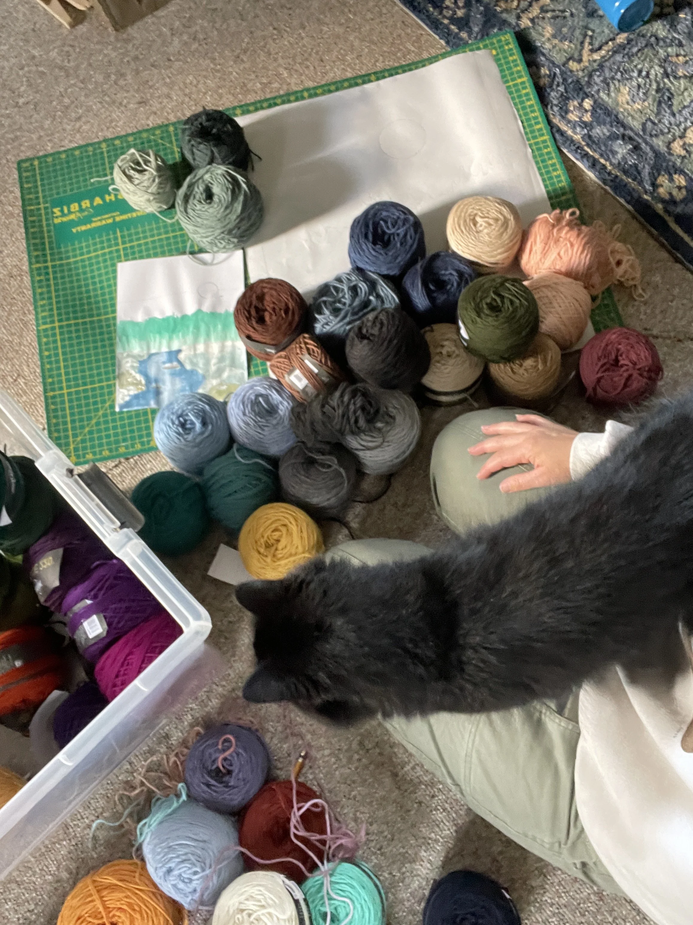 Next I pull out a big bin of Cascade 220 worsted wool yarn. I actually wouldn’t recommend this yarn for tapestry—it’s a bit too lofty—but I have a lot of it and have learned how to work with it. The color range is fantastic. I select out a bunch of colors that generally fit a palette I have in mind, then slowly whittle them away based on feeling.