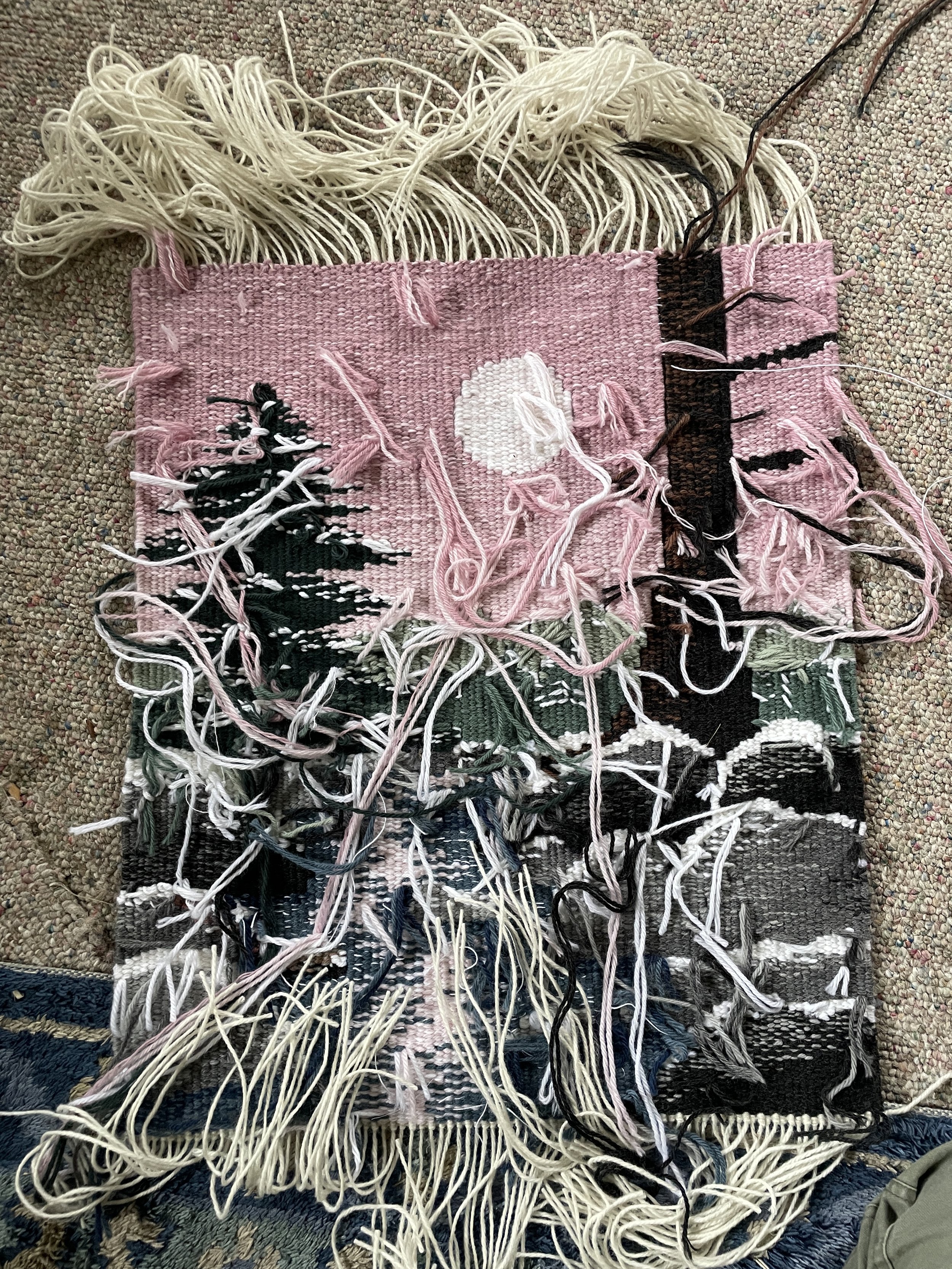 There is this internal debate when you’ve put hours into weaving something that isn’t working: to just accept it and move on, or to take the time to redo it until you’re satisfied. I couldn’t rest if one of the focal points of this piece didn’t look right. It is very frustrating to keep weaving, then unweaving, then weaving again, and to still hate it every time. But I keep going, hoping something will click eventually.