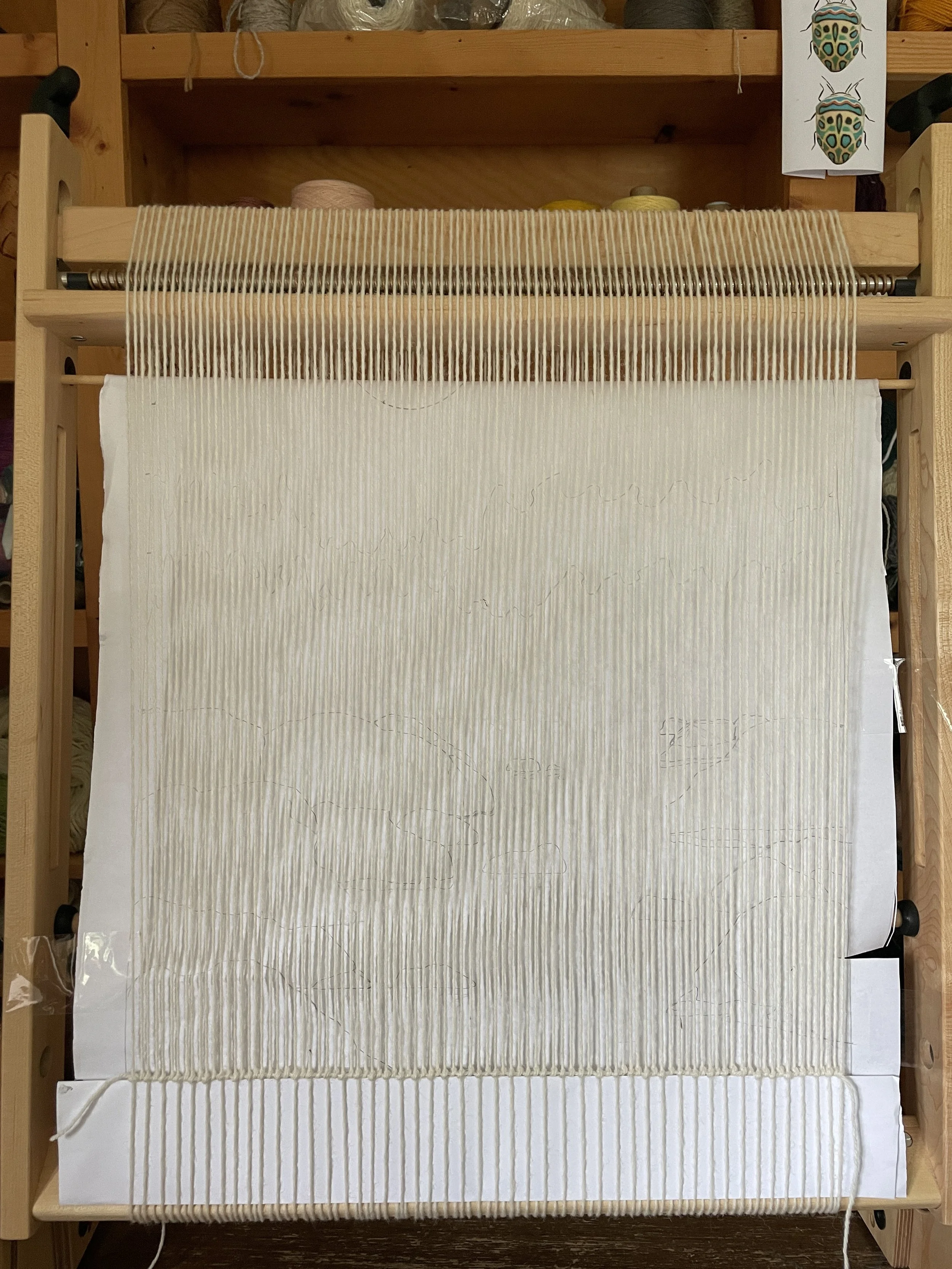 I choose a sett (the number of warp ends per inch) and warp my loom with wool string. The warp is the string stretched vertically from top to bottom, and is the foundation upon which a tapestry is built. I tie a row of half-hitch knots to secure the bottom edge, and attach the cartoon image behind the warp strings to use as a guide.